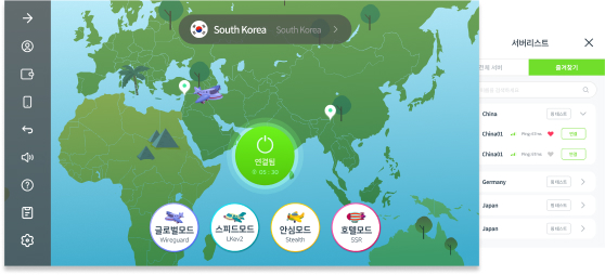 메인화면에서 연결시작 버튼을 누르면 즉시 빠른 VPN접속이 가능합니다.